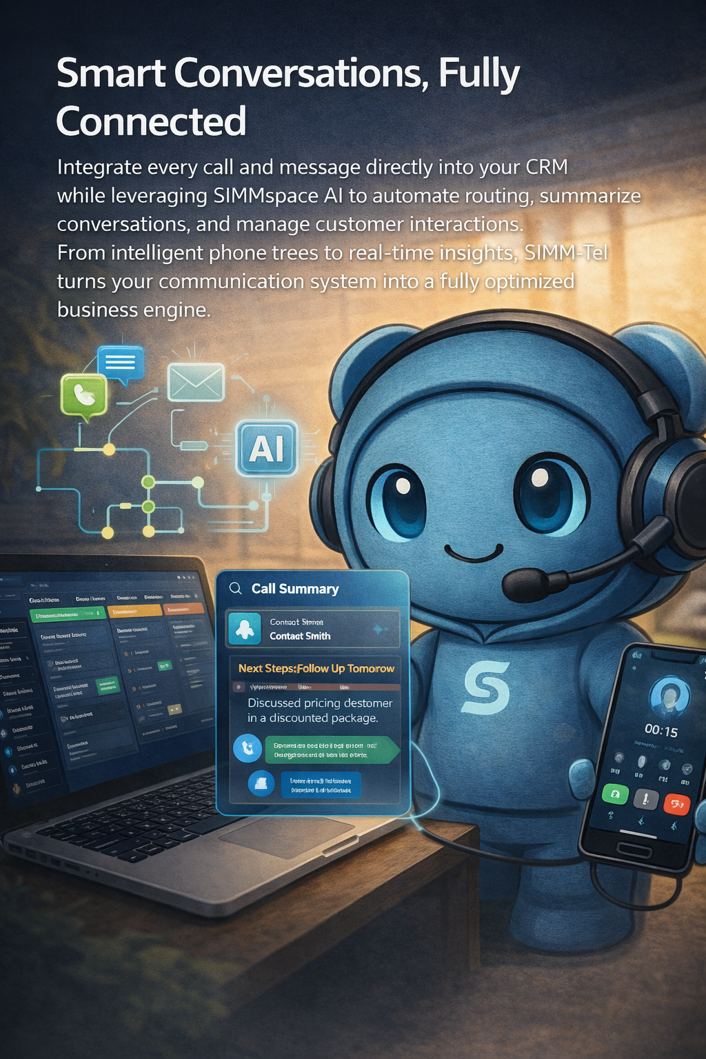 Integrate every call and message directly into your CRM while leveraging SiMMspace AI to automate routing, summarize conversations, and manage customer interactions. From intelligent phone trees to real-time insights, SiMM-Tel turns your communication system into a fully optimized business engine.